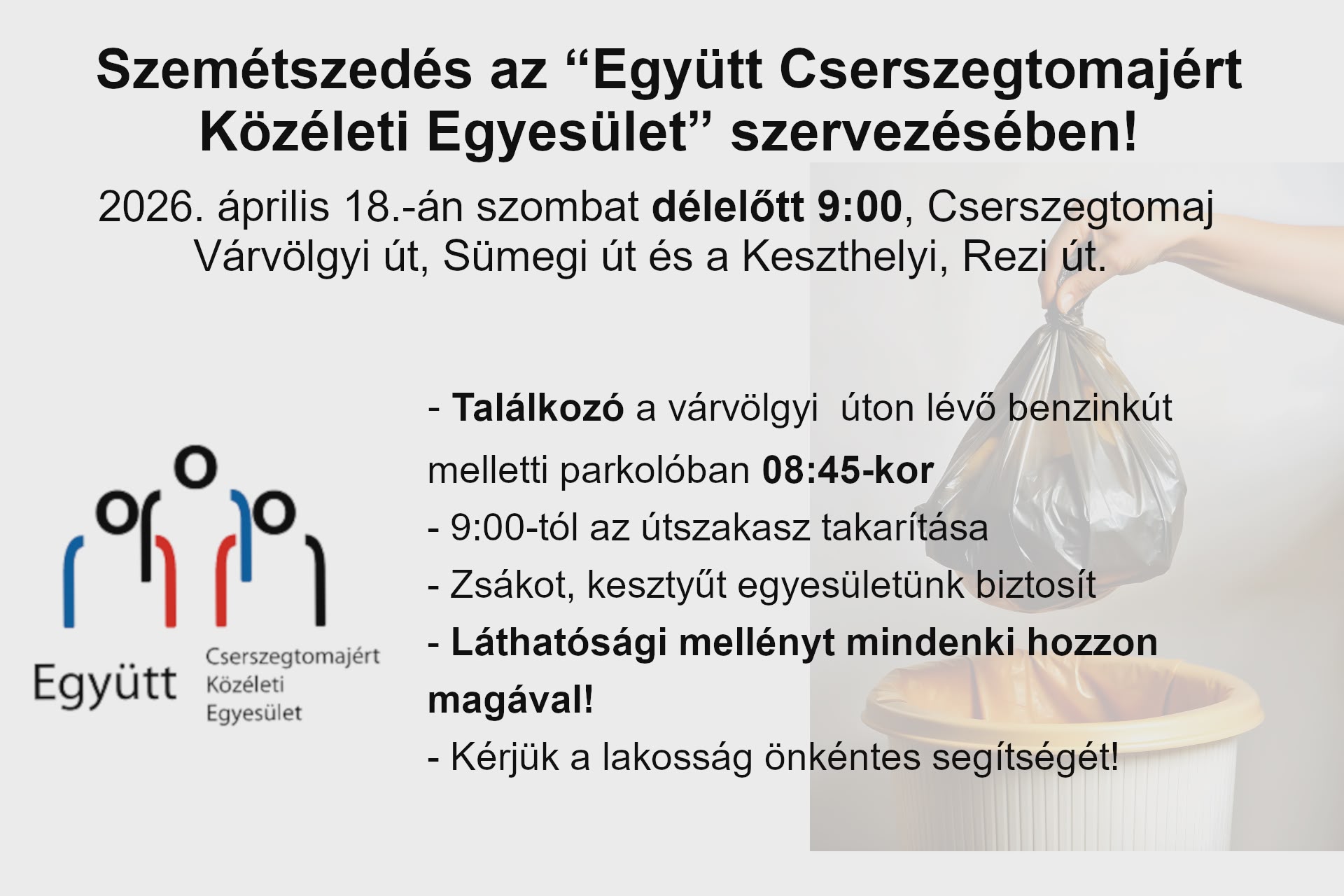 2023. november 27.-én megalakult az "Együtt Cserszegtomajért Közéleti Egyesület", 16 alapító taggal, akikben már régóta megfogalmazódott az a gondolat, hogy összefogással, közös erővel, a helyiek igényeit figyelembe véve egy igazi közösséget alakítsanak ki a településen.